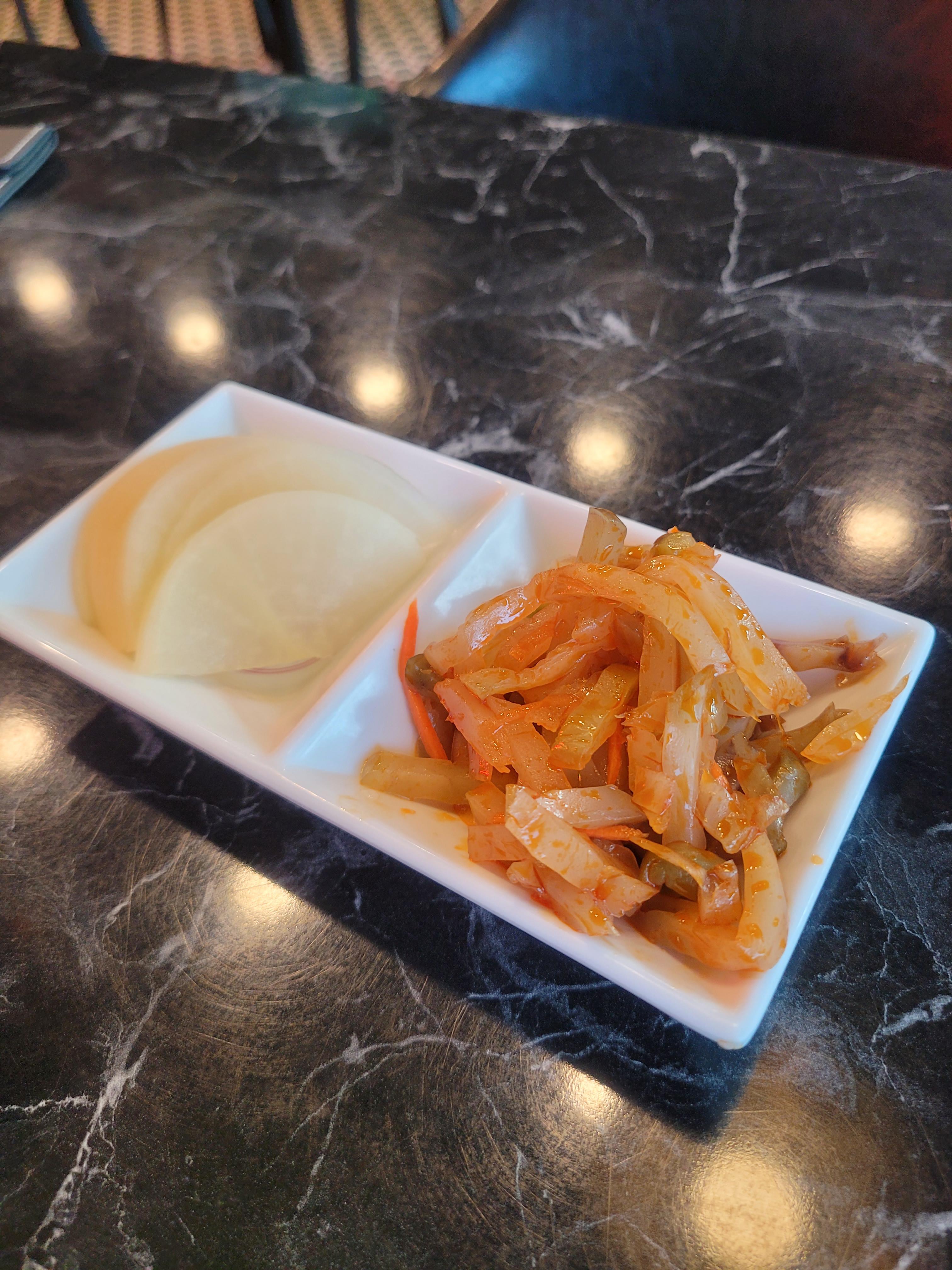 반찬으론 이쁜 연한 색깔의 단무지랑 짜사이가 나온다.