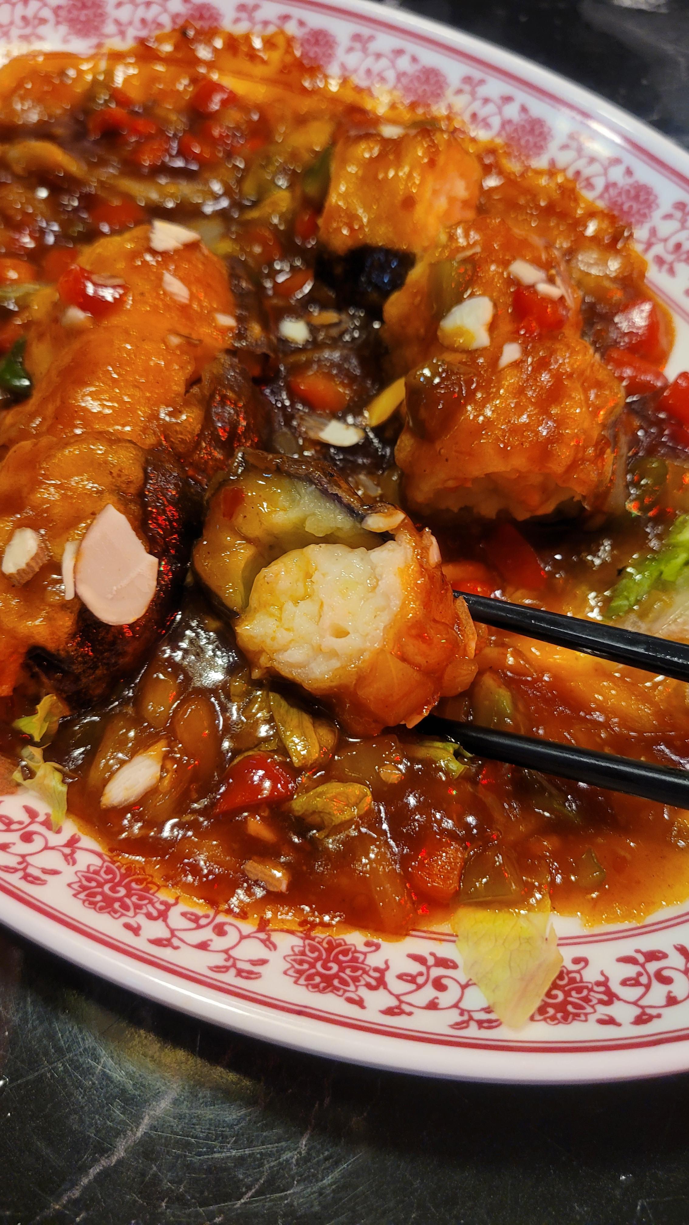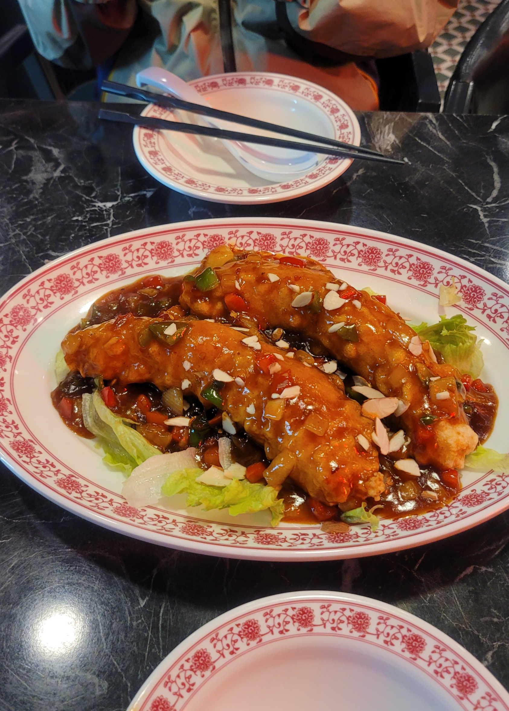 메뉴 설명란에 나와 있는 워딩을 그대로 옮기자면, 이 요리는 '가지 사이에 다진 새우살을 넣어 튀긴 후 어향소스를 뿌린 요리'이다. 흰색 국물을 시켰으니 요리는 빨간 걸로 시켜보자 해서 시켜봤는데, 비주얼이 장난 아니다. 꽤나 큼지막한 튀김 두 개가 양상추 위에 올라가 맛있는 어향소스 이불을 덮었다.