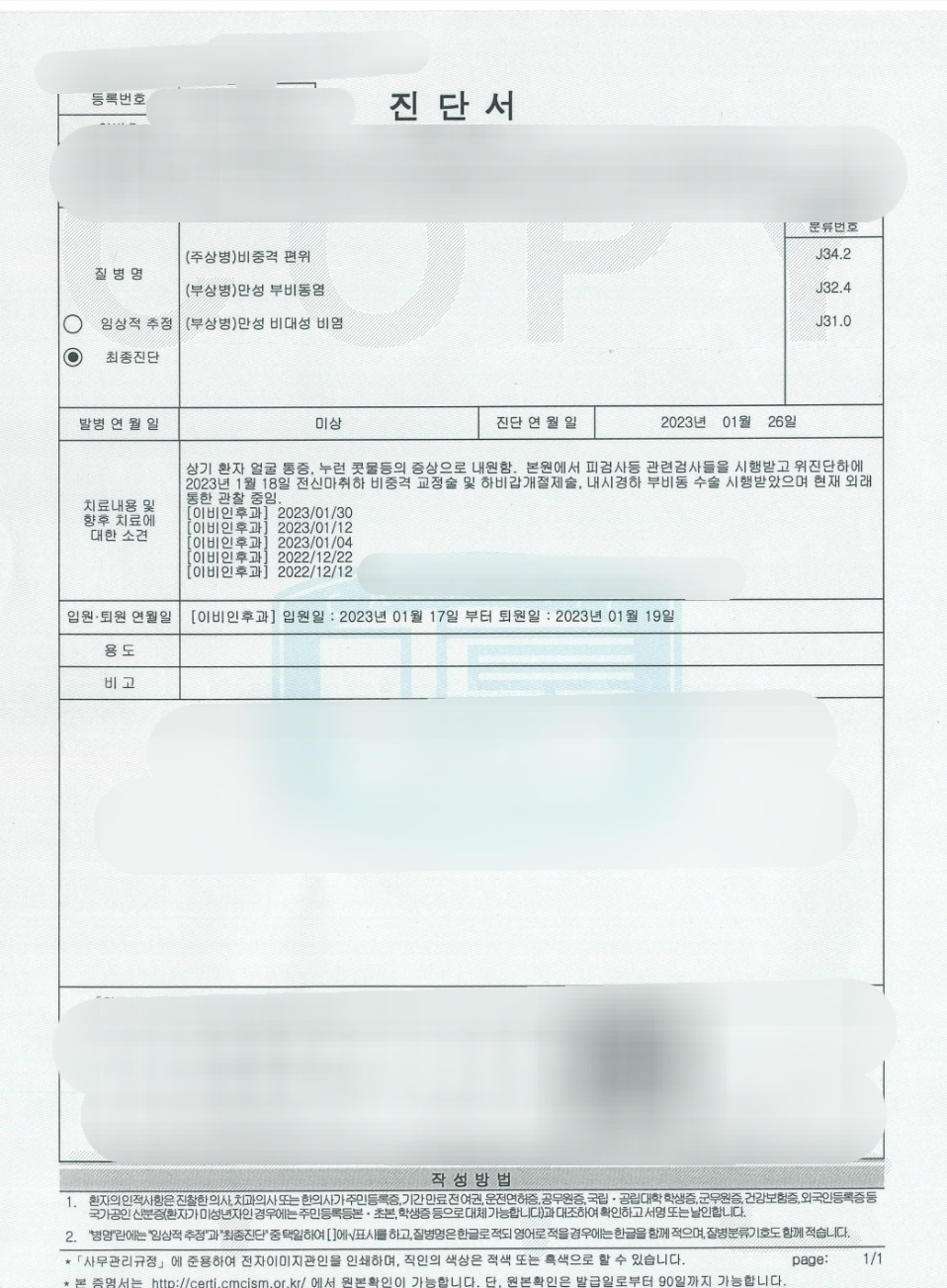 코로나 후유증 / 부비동염(aka.축농증) 치료기 (4-2) 축농증 수술과 입·퇴원 후기